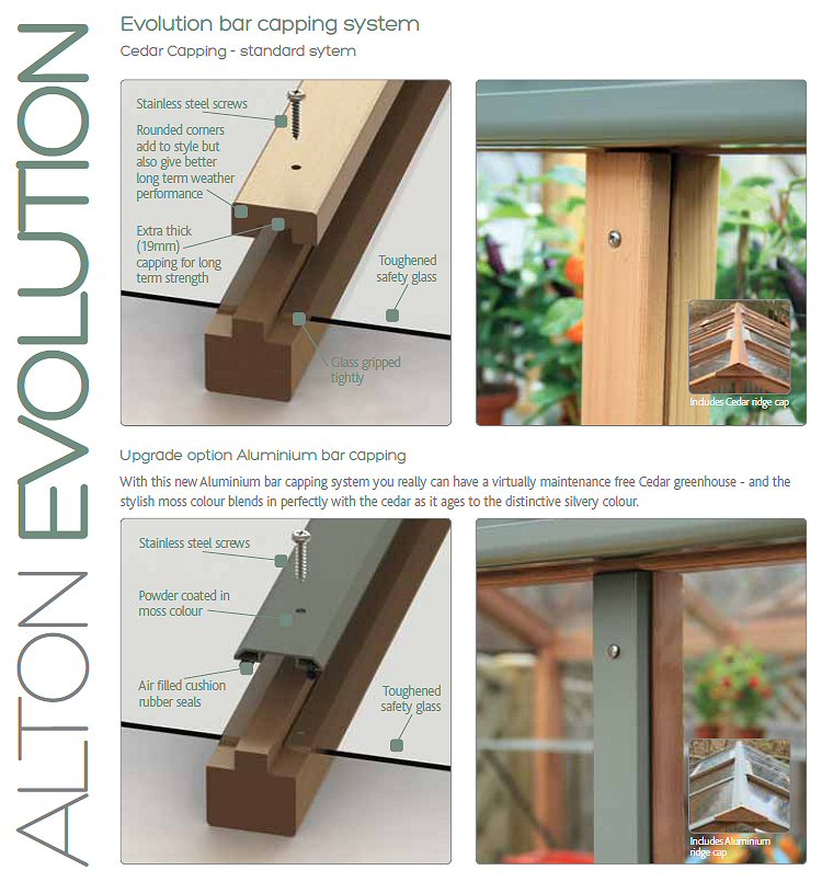 Bar capping system – Most wooden Greenhouses have glass held in by a beading or a groove. The result of this can be that the glass ‘rattles’ in the frame. The Alton Evolution’s newly developed bar capping system uses the toughened glass as an integral part of the overall strength of the greenhouse by gripping it tightly. When you feel the greenhouse, there is little or no movement in it and you can see that it is far stronger (and you don’t get a rattling sound from the glass).