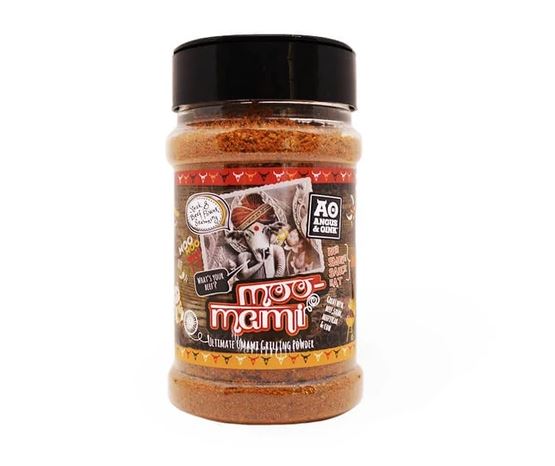 A blend of spices, herbs, chillies, salts and umami forms the Moo Mami beef grilling powder. Inspired by great steaks and radical brisket cooks, from flame to deep smoke. We have loaded this with mega flavour to bring out the best in beef while building a monumental crust or bark. Umami depth comes from soy, seaweed and mushroom while chipotle, ancho and mulato chillies give a great balance of heat. Various levels of sugars help absorb the rubs into the meat. Pineapple powder has been added to help tenderness.