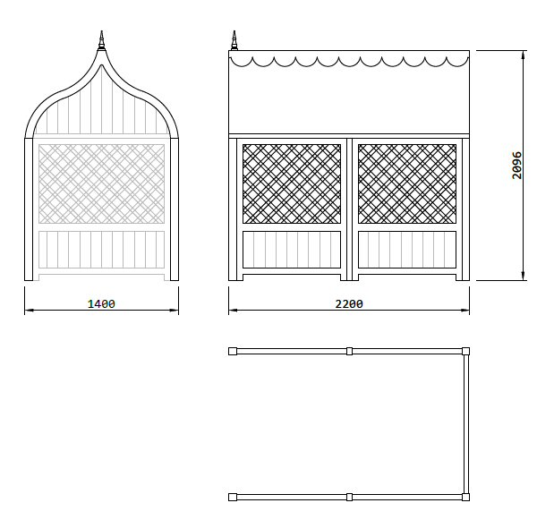 Standing at 2.09m tall (excluding the roof finial) it has been designed to give plenty of headroom while riding the bikes in, and while standing when you dismount. The open front is full height also, including the curved gothic roof shape, and is flanked by trellis paneling on both sides and the rear to give a view both in and out. These walls can constructed of open diamond trellis work as shown, or solid walls of boarding as used in the lower panels.