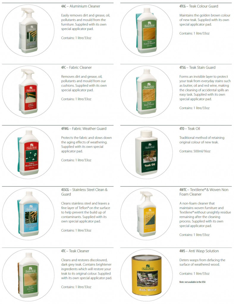 We recommend the following range of our Barlow Tyrie products to care for and maintain your Teak furniture.