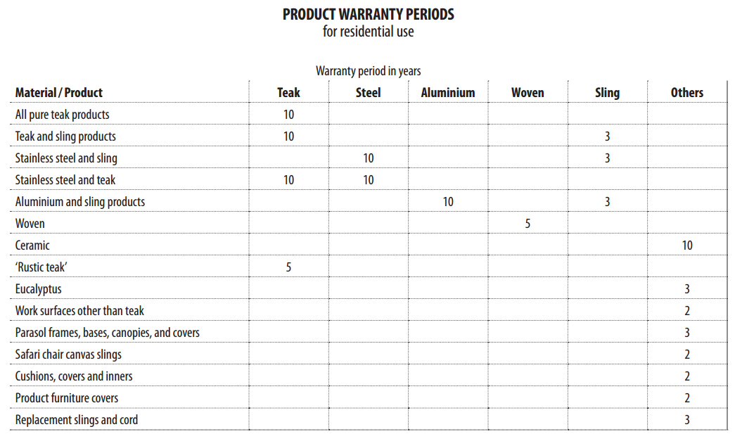 Teak is a natural material and as such fine cracks in the end grain of components, e.g. legs and arms, may appear and then disappear with variations in the weather and the consequent change in the moisture content of the wood. Such fine cracks are normal, especially in heavier components, and will not affect the life or serviceability of your furniture.