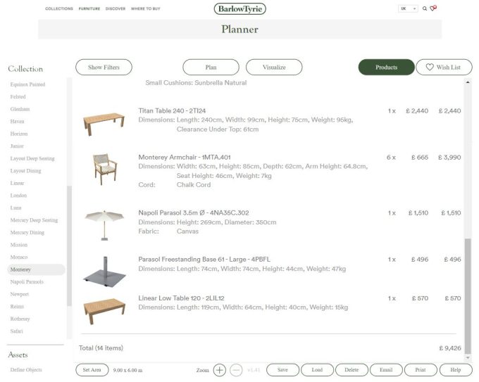Simply set the area & shape of your Garden | Terrace | Courtyard or Commercial outdoor seating area, and drag & drop anything from the Barlow Tyrie Garden Furniture range into your area. The planner will allow you to plan your new area with Dining | Lounge and Modular Furniture + Parasols | Bases and Accessories – all to scale, and be viewed in plan format or 3D digital render of what the proposed items will look like in place – you can even add your own background & see the furniture in place. All items are also loaded into a Products list with an instant RRP Quotation