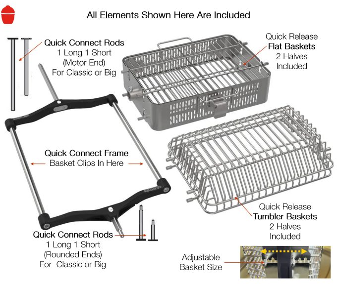 The JoeTisserie® Basket Kit allows you to add a flat basket or a tumbler basket to your JoeTisserie®. The included quick connect rod makes installation stress-free. The kit includes multiple quick connect rods so it is compatible with both the Big Joe™ and the Classic Joe™ JoeTisserie®