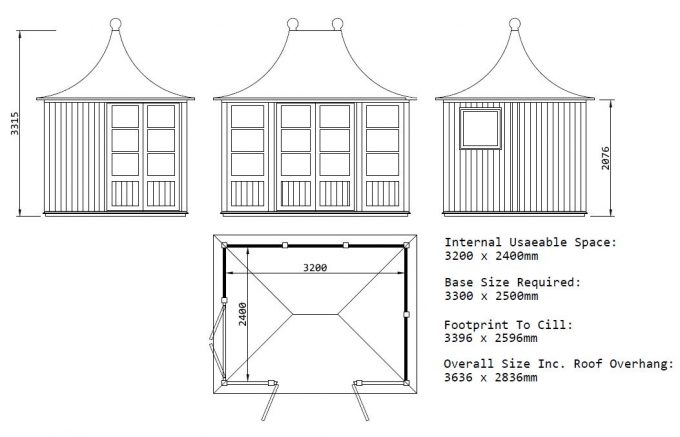This building would ideally require a 3300 x 2500mm Concrete Base (or paving slab base) +100mm larger than the Nominal (Internal size)