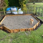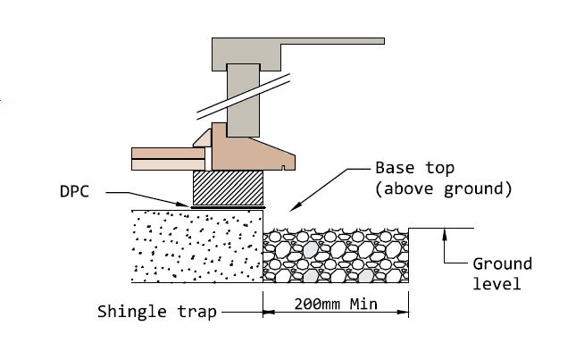 The hardwood sills, then overhang the base and our pressure treated Sub-b fame & Damp-Proof-course by 48mm on each edge, and feature a drip-gap, under the Sills. We would highly recommend incorporating a 200mm French Drain / Gravel Trap in addition to your base measurements, this will form an area for rainwater to soak away, and stop any splash-back up onto the walls of the building.