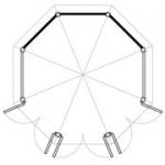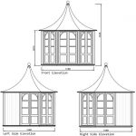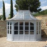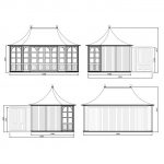 Octagonal design, with 8 symmetrical walls. Ordinarily 3 pairs of double French doors, 2 fixed glazed 6-pane walls & 3 solid walls, placed as you wish, or manufactured with more | less glazing.