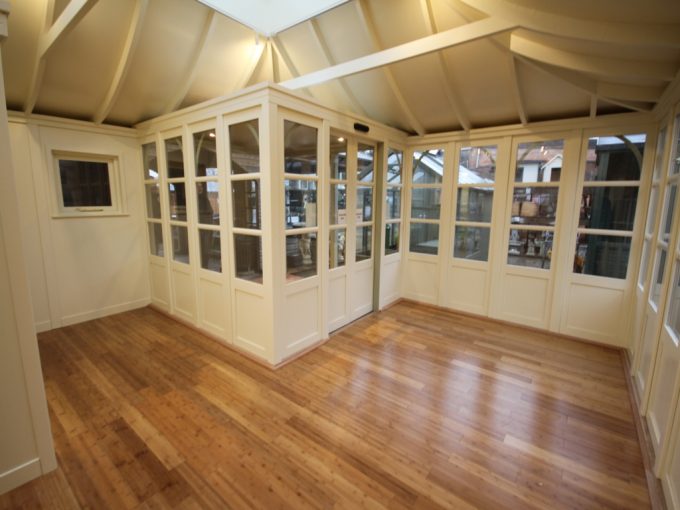 Hexagonal by design, the Holkham is a well lit & ventilated building, with six sides and beautiful proportions. Available in 2 sizes, a small & cosy 1.9m version and a larger 2.4m. Both feature 3 pairs of double French doors, and 3 solid panels as standard. And a no cost option of the pointed “Cathedral” or glorious “Bell” style roof.