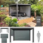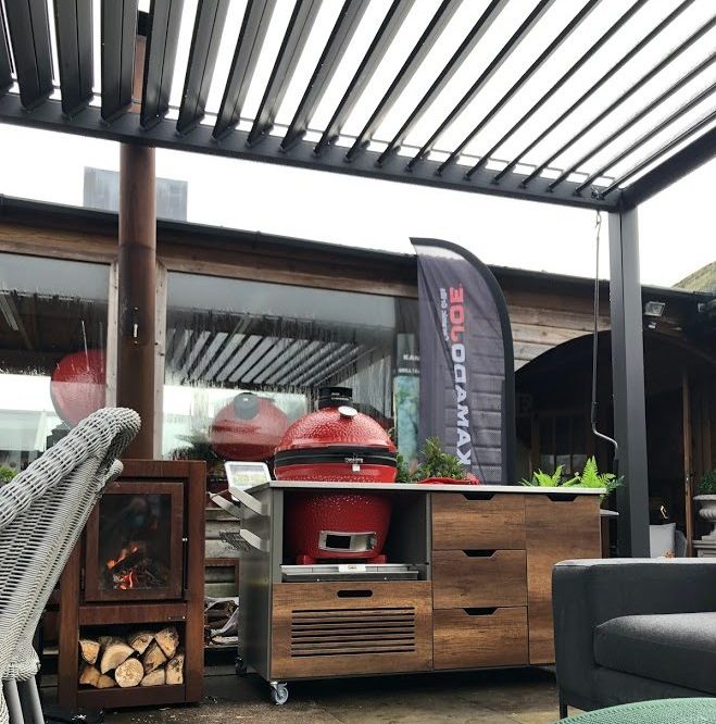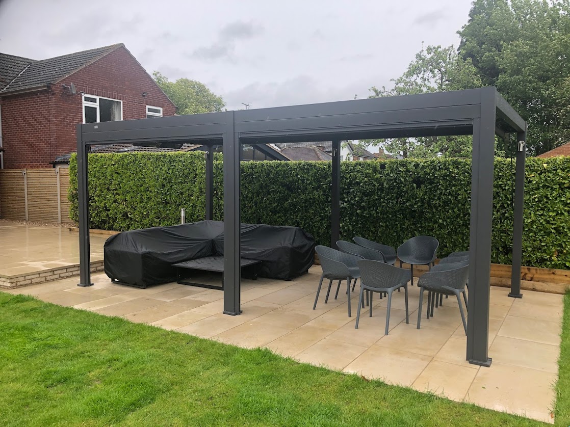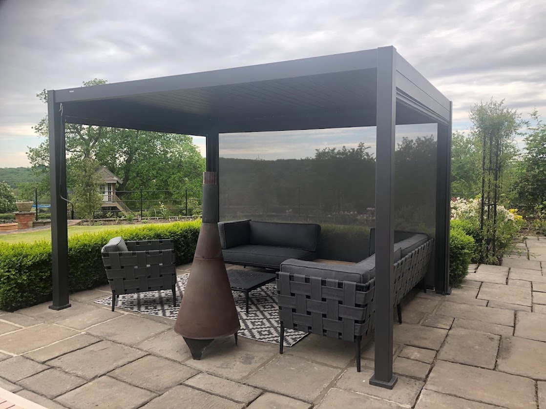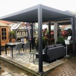 At Birstall Garden & Leisure we specialise in Aluminium Pergolas | Gazebos designed to extend your outdoor season. Waterproof Pergolas with rotating louvre blades – each with it’s own integral rainwater gutter, all blades disperse the water to the perimeter guttering system, and drain down the corner legs. Creating a stunning all weather pergola rain or shine.