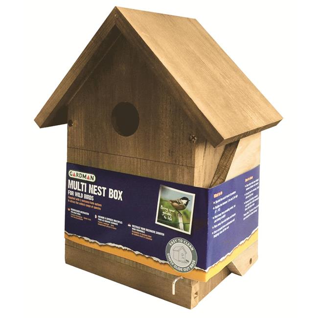 Nest box made from FSC certified timber. The interchangable front allows you to attract a variety of wild birds making the entrance hole 32mm or 28mm. The floor is removable for quick, easy and mess free cleaning.