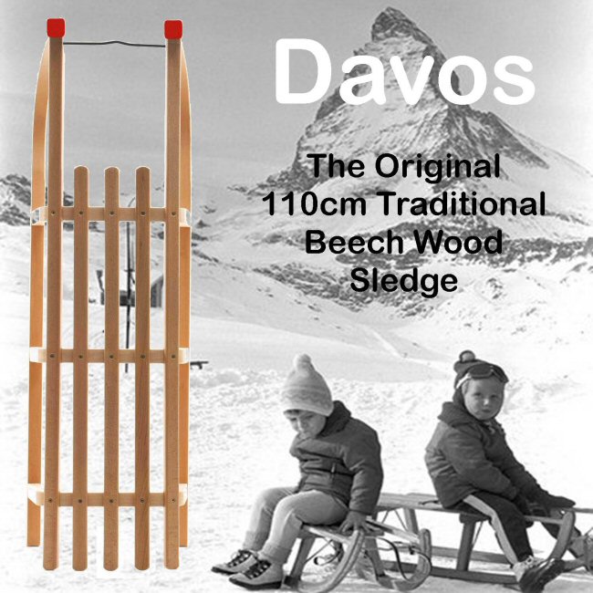 The Classic Davos (Davoser Rodel) 110cm is the ultimate traditional wooden sledge. Perfect for one rider or this model will quite happily accommodate two people as the seating slats are 78cm long x 27cm wide, and tested to take 220kg.