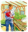 NOVEMBER ... From now on ventilate freely whenever outside temperatures permit to deter grey mould fungus and fumigate with fungicide smokes for the same reason. Special attention to ventilation is needed with non-flued paraffin and gas heaters. Tap off any condensation that forms on plastic lining to get maximum light and keep all glass sparkling clean over the winter months. Many pot plants, like fuchsias and pelargoniums should now be rested by keeping on the dry side. Cut out any straggly growth. Sow lettuce and other salad crops for winter. Some can be gently forced if grown in beds with soil warming cables. Make sure you have a maximum and minimum thermometer regularly reset to check on minimum temperatures. Plant grapevines in pots, or with the roots outside the greenhouse and shoots trained inside. Dig up rhubarb crowns from the garden and force into growth under the staging. |