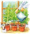 JANUARY ... Sow hardy annuals for growing as pot plants. Most dwarf, compact varieties are suitable. In a warm propagator, sow slow-growing plants like begonias and Fl hybrid geraniums for summer bloom. Gloxinias, streptocarpus, and smithiantha can also be sown in the warmth of a heated propagator. Sow freesias for summer flowers. Sow salad vegetables like lettuce and carrots. Chrysanthemums and carnations can be propagated from cuttings using small shoots growing from plants saved from last year. New cuttings can be bought from specialist nurseries. Prepare or buy-in seed and potting cormposts for the busy months ahead. Pot-on plants like calceolarias, cinerarias, primulas, schizanthus, and salpiglossis, being grown for early spring display. Watch out for leaf moulds on these, and spray with systemic fungicide if necessary. Ventilate whenever weather permits. |