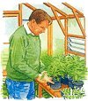 MAY ... Set out tomatoes and cucumbers in growing begs or 9in pots. Avoid growing in the border soil if it hasn't been sterilised. Attach strings or wires to roof bars to train cucumbers and melons. Tomatoes can be given vertical strings for support. Other crops like sweet peppers, aubergines and Cape gooseberries, should also be potted into their final containers and may need supports later. New plants of pelargoniums, fuchsias, chrysanthemums and perpetual flowering carnations, bought-in as rooted cuttings earlier, will need potting as roots fill the pots. Sow all kinds of greenhouse primulas, as well as cinerarias and calceolarias, for display from Christmas onwards. Harden-off bedding plants by standing them outside during the day, or placing in cold frames. |