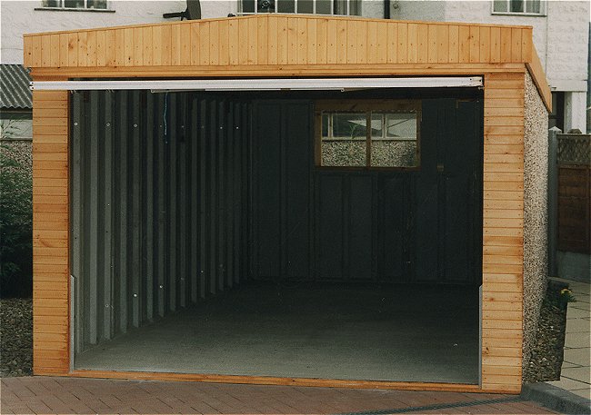 16ft x 8ft 6in Pent Roof Garage with wooden front, 7ft steel up and over door (shown open), rear window and tapered facia. |