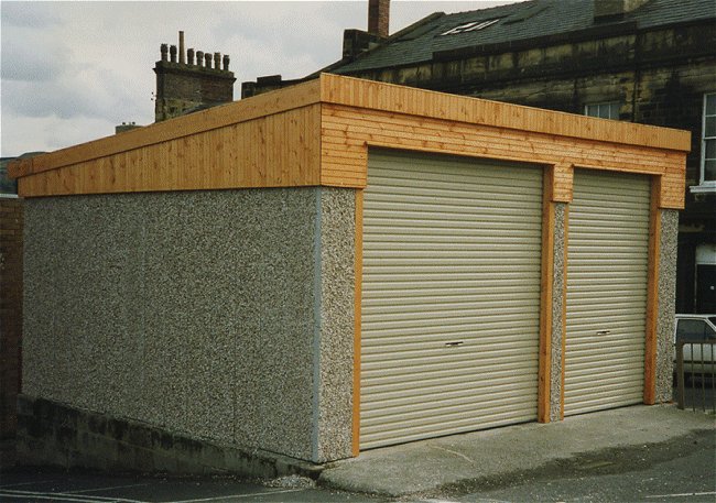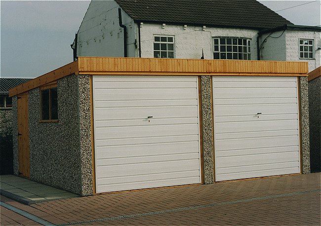 16ft x 16ft 6in Pent Roof Double Garage with stone front, 7ft steel up and over doors, personal door, side window and flat facia. |