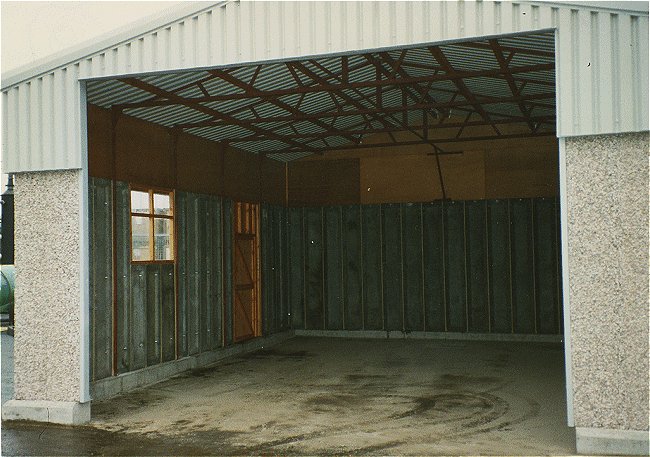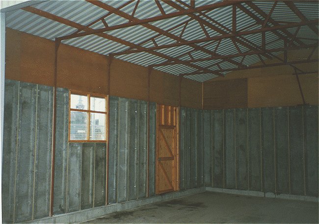 View inside Industrial Unit showing steel trusses and wooden skirt to eaves. |