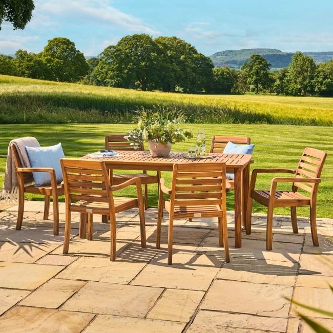 Crafted in collaboration with the National Trust, the Rectangular Dining Table combines timeless design with sustainable craftsmanship. Made from premium oiled Acacia wood, its natural grain and rich finish highlight the wood's character, ensuring a unique piece that enhances any outdoor space while reflecting a commitment to quality and heritage.