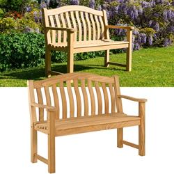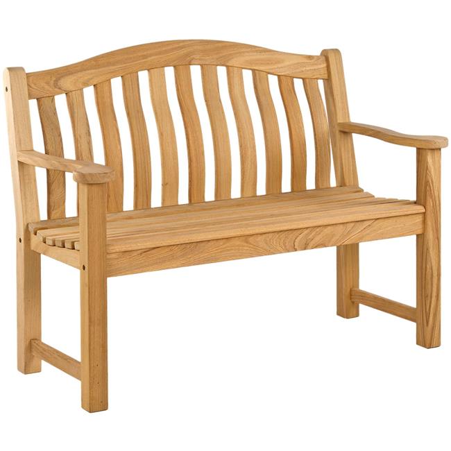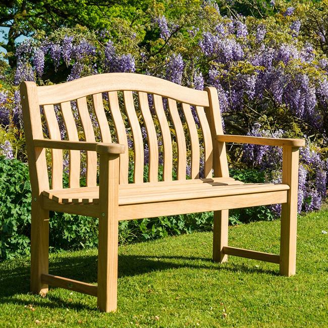 We can just picture this classic, small bench next to a pond, or in a cosy corner of the garden. It’s 4ft in length, so it’s designed for two people. It has a beautifully smooth finish, with a closely interlocked grain in the wood. The slatted back, the rounded arms, the curved arch at the back – they all tick that quintessentially English brief. If you want to leave this bench outdoors during all weathers, it’ll mellow down to a silver grey appearance over time.