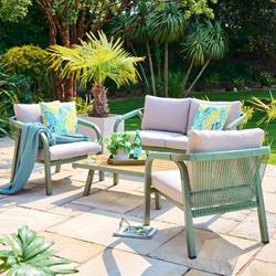 The olive green powder-coated aluminium frames are rust-resistant and built to last, while the backs of the sofa and chairs feature woven rope detailing for added texture and visual interest. Soft 230gsm polyester cushions provide lasting comfort, and the coffee table is topped with responsibly sourced timber for a warm, natural finish.
