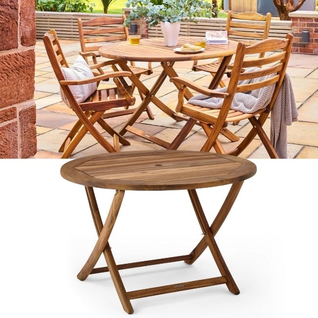 Compact, elegant, and practical, the Redcliffe Folding Round Dining Table is a perfect choice for smaller outdoor spaces. Crafted from solid Acacia hardwood, it features a warm golden-brown tone and attractive grain, enhanced by a smooth, hand-sanded finish and a protective oil coating for added durability.
