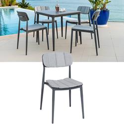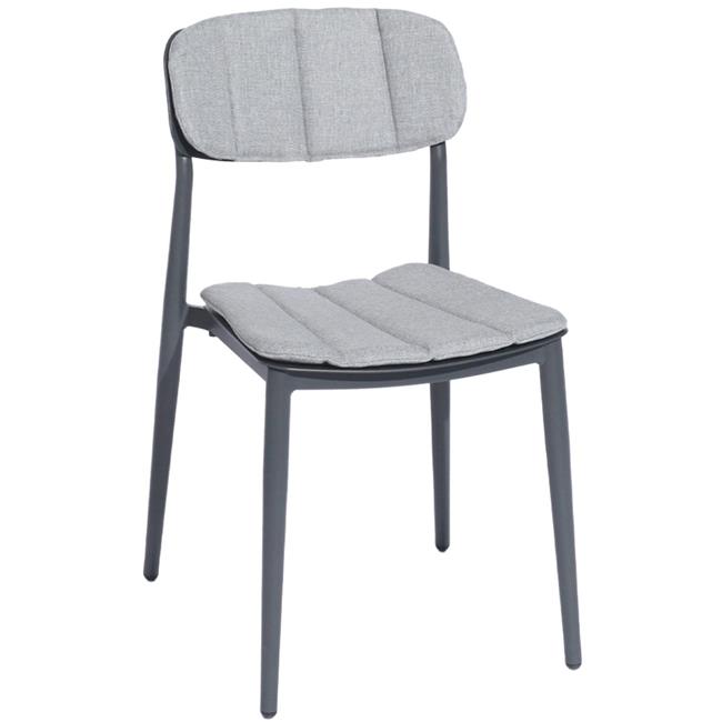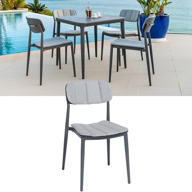 Slightly tapered legs made from aluminium proudly support this comfortable seat to form this attractive Rimini side chair. The elegant shape looks modern and unimposing and they can be stacked together for easy storage when they’re not in use. The Rimini collection is known for its durability, so you can leave this chair outdoors in cold and rainy conditions safe in the knowledge that it won’t rust. The cushions are included and are fixed to the chair back using toggles.