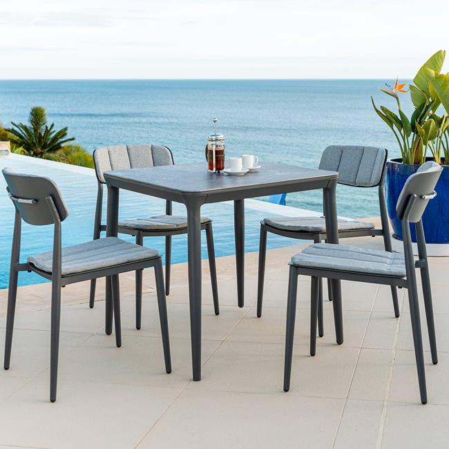 The Rimini collection has two very prominent qualities – firstly the products are sleek and elegant with angular, modern edges, which give an effortlessly sophisticated look to your space. And secondly, the collection is extremely durable and can withstand the harshest weather conditions. The products are made from powder coated aluminium, finished in a textured matt grey.