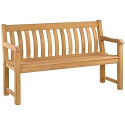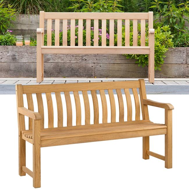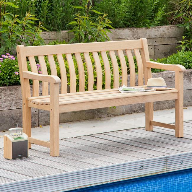 Here is a classic, traditional bench spanning 5ft in length – perfect for two to three people. It has a square frame, with slightly rounded arms and a curved, slatted back. The quality of the Roble wood from which it’s made is excellent – and comparable in durability to that of teak. Not only is the quality of the wood exceptionally high, it’s also sustainable too, with the FSC stamp of approval.