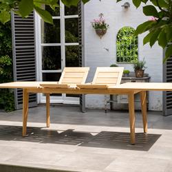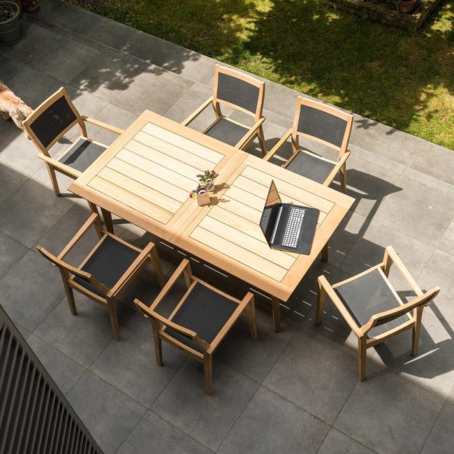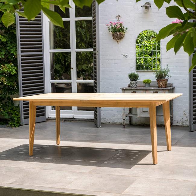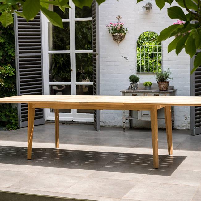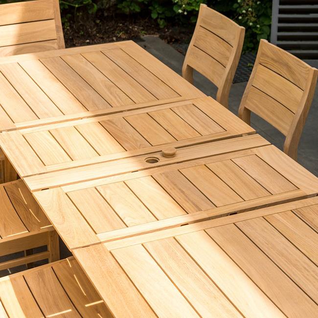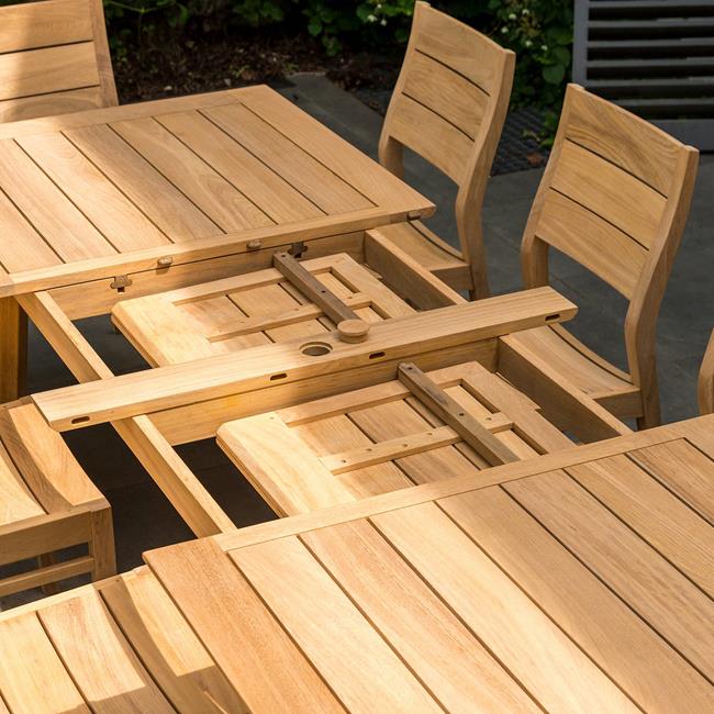 This table is a real show stopper, absolutely perfect for outside dining and entertaining. It’s made from the beautiful Roble wood which is a light honey coloured, hard-wearing timber. It’s easily extendable and is beautifully contemporary with squared corners and a slatted top. When unextended it measures 2m in length, making it the perfect table for 6 people. Or, in just a minute can be transformed into a full-size 10 seater dining table with an added 88cm, making the total extended length 2880mm. Even if it’s left outside, untreated, it still has a life expectancy of 25 years.