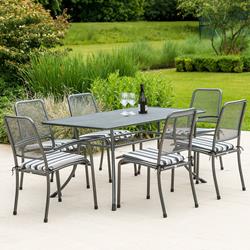 Buying furniture for outdoor use doesn’t have to be stressful. This table is resolutely practical and easy to maintain as it’s made from durable steel which has been powder coated. This ensures it’s resistance to both corrosion and rust, even when left uncovered outside. It’s durable and long-lasting, but not at the expense of it’s design, which is both elegant and attractive. The table top is made from intricate wire mesh which sits proudly on top of it’s modern curved legs. You could comfortably seat four at this table, and six if you were to add two more chairs at each end.