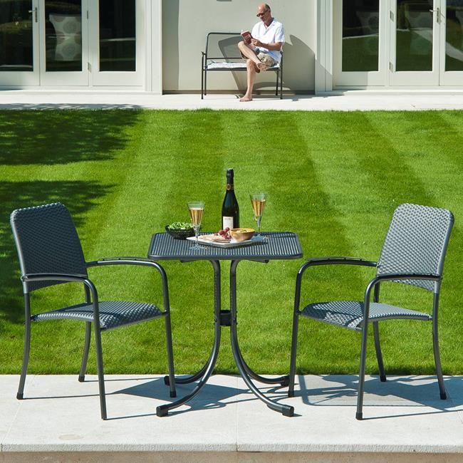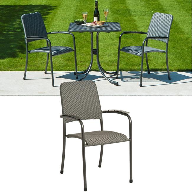 Bring a touch of Italian sophistication to your dining set up with these beautiful armchairs. The frame is made of durable powder coated steel and the weave from weatherproof synthetic fibres in a stylish grey. These materials are incredibly durable and can withstand even harsh weather conditions. The arms at both sides provide added support and comfort and a place to rest the arms after a long day too.