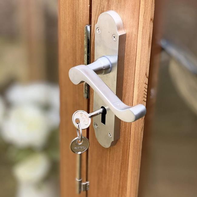 - Double doors with large window panes & mortice lock