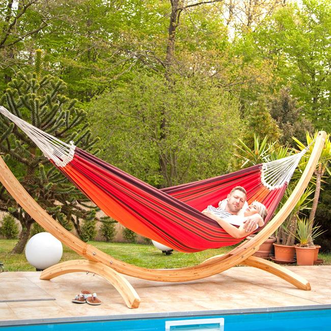We have optimised our biggest and most popular stand Arcus. It is still made of sturdy larch wood with stainless steel fittings but we have adjusted the size of the stand better to our current hammock models. An oil-based protective surface coating gives the larch wood a wonderful, warm sheen.