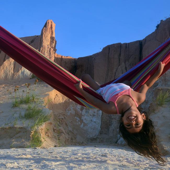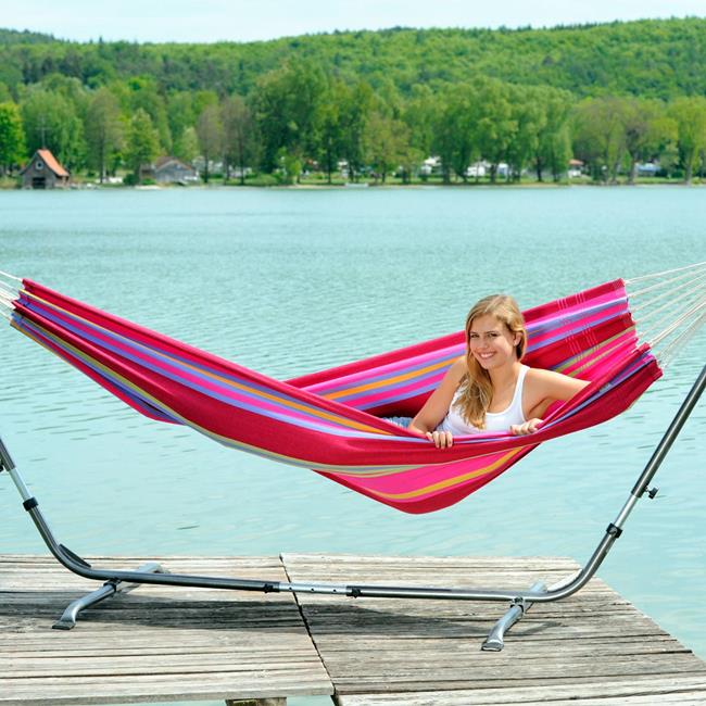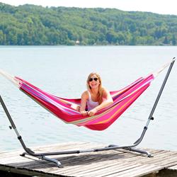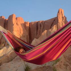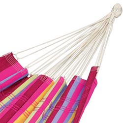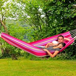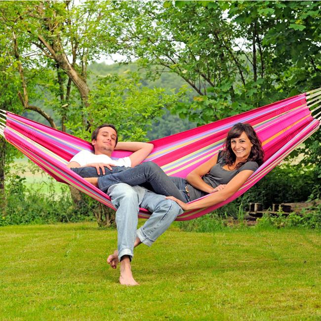 Barbados is the hammock for a relaxed games of doubles. Super-wide, snugly comfortable, very robust and virtually indestructible, it is the ideal place for couples. Of course, it is also possible to lie alone in Barbados and dream of how nice it would be to share the hammock happiness ... Whether hung on the balcony, in the garden or indoors, whether for first-timers, up-graders or real hammock experts, Barbados is always exactly the fitting, colourful decoration for every place, similarly as a present that gives everyone pleasure.