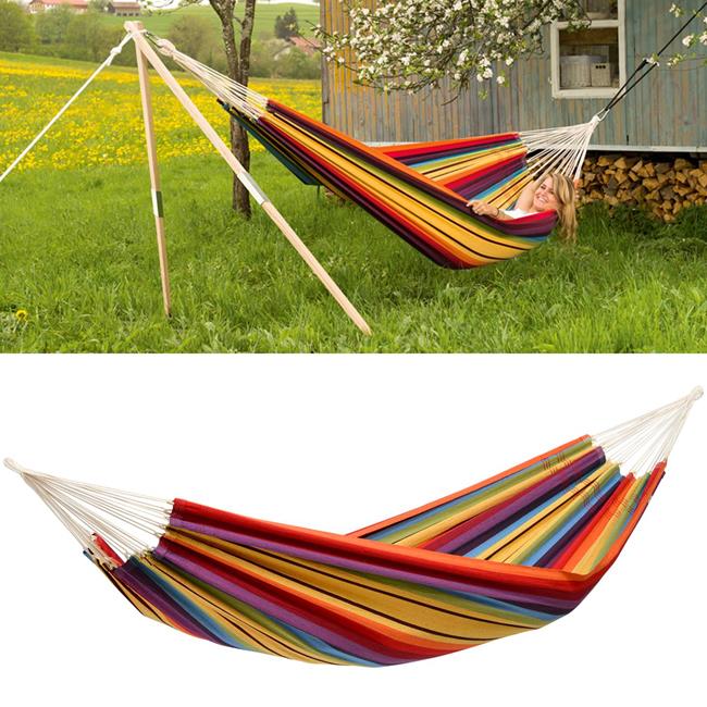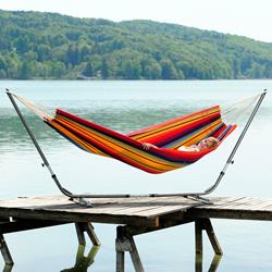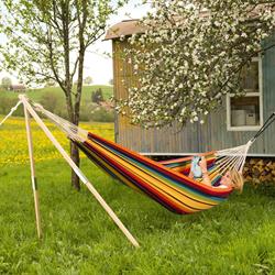 Barbados is the hammock for a relaxed games of doubles. Super-wide, snugly comfortable, very robust and virtually indestructible, it is the ideal place for couples. Of course, it is also possible to lie alone in Barbados and dream of how nice it would be to share the hammock happiness ... Whether hung on the balcony, in the garden or indoors, whether for first-timers, up-graders or real hammock experts, Barbados is always exactly the fitting, colourful decoration for every place, similarly as a present that gives everyone pleasure.