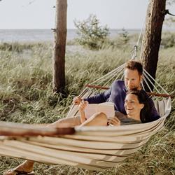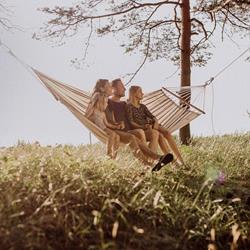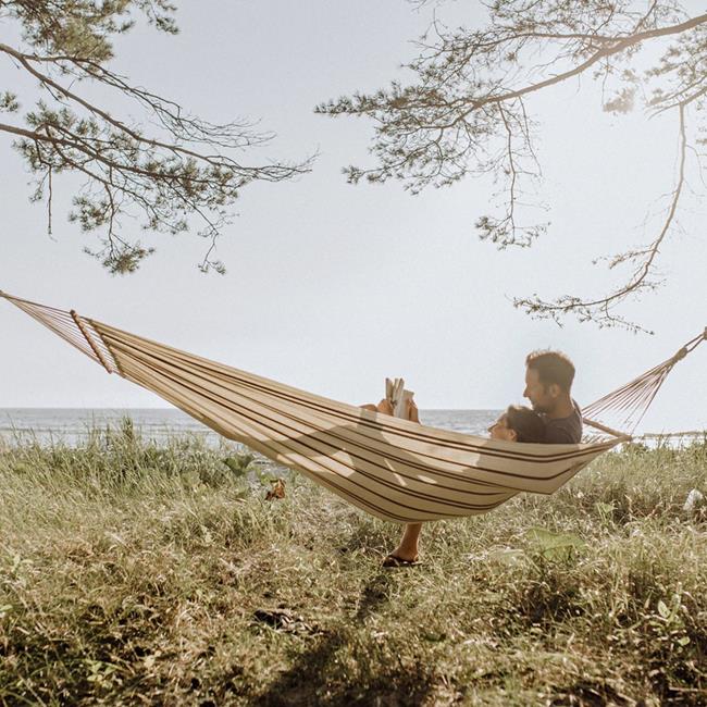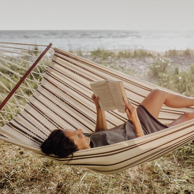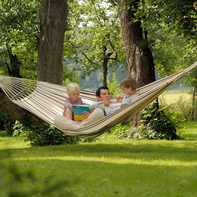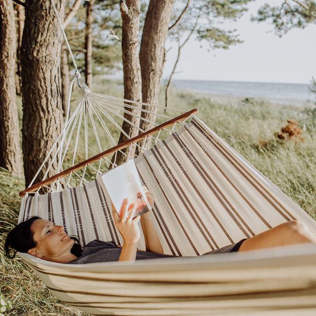 We have managed to make our spreader bar hammocks as comfortable as the classic Brazilian hammock with no bar. This is achieved by firstly using a special, amazingly soft and flexible thread in a high quality thickness (350 g/m²), and secondly by making the material significantly wider than the bar: 140 x 80 cm bar. This provided for a wonderful arch in which one can hang comfortably and securely!