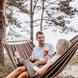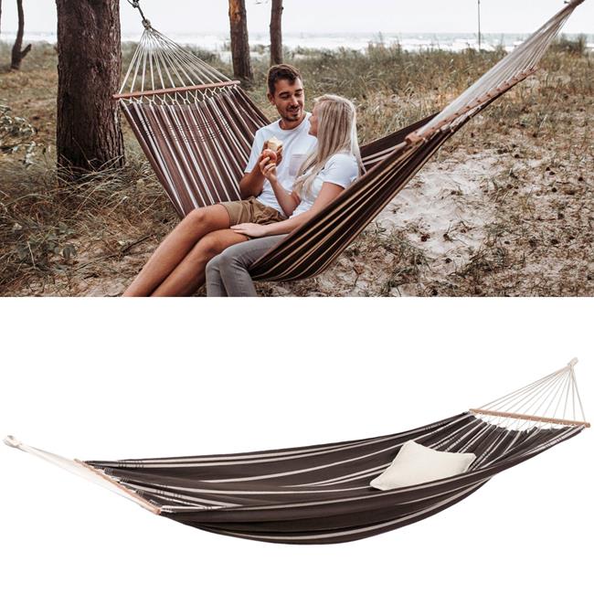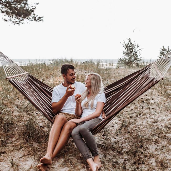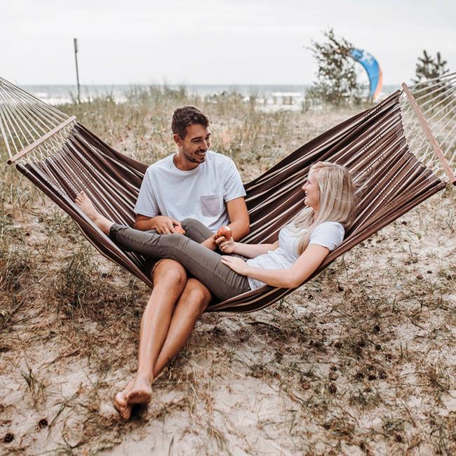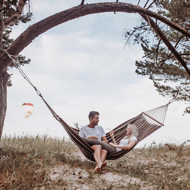 We have managed to make our spreader bar hammocks as comfortable as the classic Brazilian hammock with no bar. This is achieved by firstly using a special, amazingly soft and flexible thread in a high quality thickness (350 g/m²), and secondly by making the material significantly wider than the bar: 140 x 80 cm bar. This provided for a wonderful arch in which one can hang comfortably and securely!