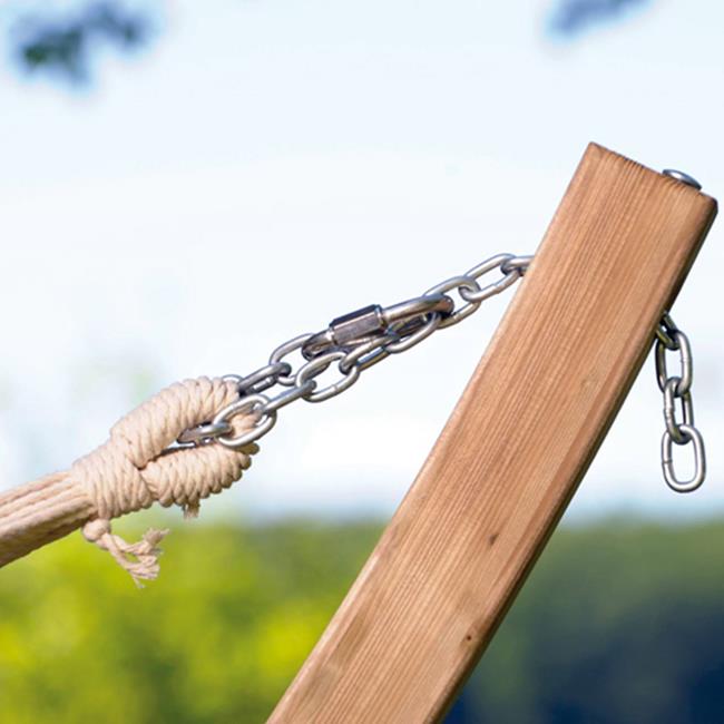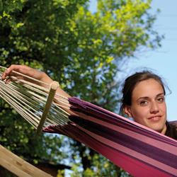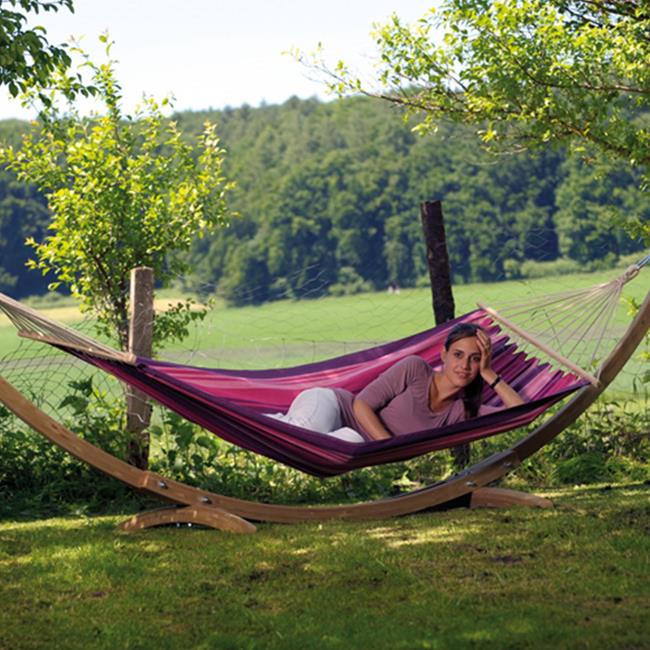 The elegant handcrafted stand is made of spruce and is highly stable and secure thanks to its quality glue laminated wood structure. Not a giant but comfortable – thanks to extra-long cords and an extra-broad cloth width we have accomplished that even smaller hammocks are really comfortable! The hammock is made of EllTex and provides optimal resistance to weather and UV light.