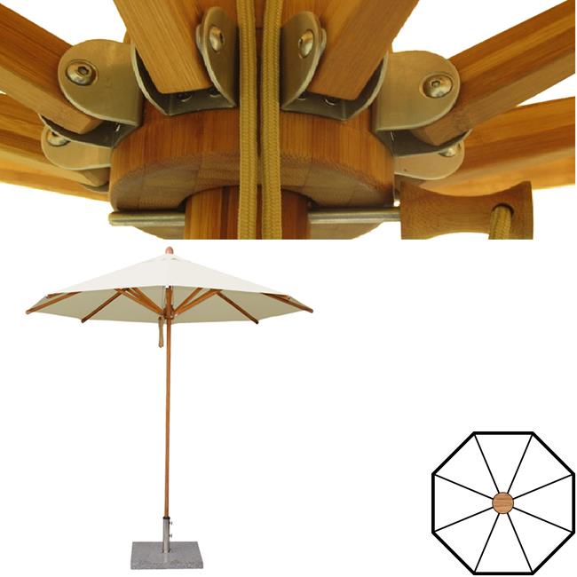 The Levante Parasols are Bambrella’s most premium and popular parasol, made using a single piece pole for extra strength and durability. The pole, ribs, hubs, runner and finial are all made using laminated bamboo and all metal fittings are 304 stainless steel. Their double pulley and rope system ensures easy raising and lowering of the parasols, even on the largest of models.
