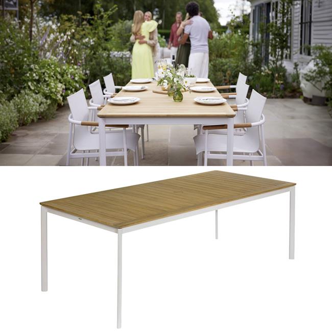 Barlow Tyrie AROUND is a fusion of premium grade plantation Teak with powder coated Aluminium. Stackable dining and carver armchairs with comfortable Sunbrella chair slings and a choice of 154 and 215cm dining tables to accommodate 4 - 8 guests - multiple tables can be placed in a row to create tables to seat as many guests as you wish. Available in a range of Dining and Modular Outdoor Lounge furniture