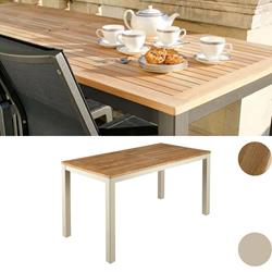 Powder coated aluminium and teak give this table a contemporary look with aluminium accents in the top. A teak cap is supplied for use without a parasol.