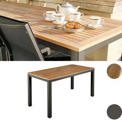 Powder coated aluminium and teak give this table a contemporary look with aluminium accents in the top. A teak cap is supplied for use without a parasol.