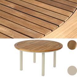 Powder coated aluminium and teak give this table a contemporary look with aluminium accents in the top. A teak cap is supplied for use without a parasol.