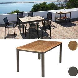 Powder coated aluminium and teak give this table a contemporary look with aluminium accents in the top. A teak cap is supplied for use without a parasol.