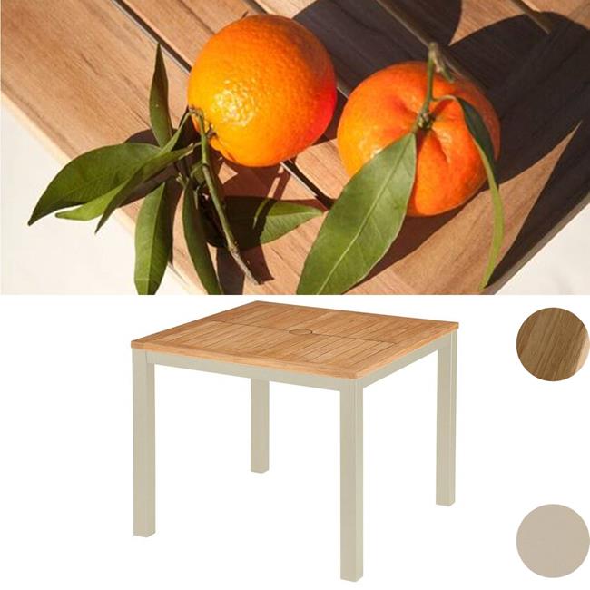 Powder coated aluminium and teak give this table a contemporary look with aluminium accents in the top. A teak cap is supplied for use without a parasol.