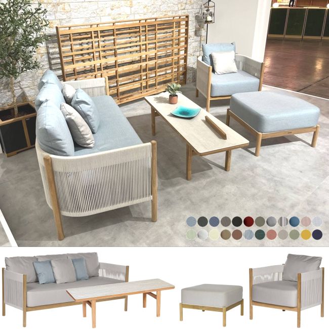 Barlow Tyrie Cocoon Teak & Soft Rope outdoor lounge furniture. Combines smooth grain plantation Teak & soft rope cord to create a beautiful collection of outdoorlounge furniture. Available with a choice of 20+ Sunbrella UV & Waterproof cushions.