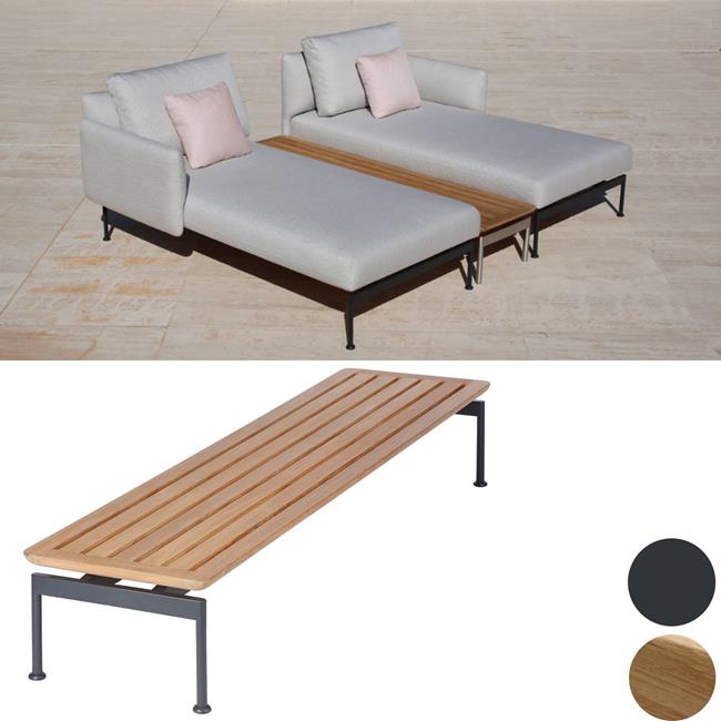The collection comprises two sizes of upholstered seat (Single & Double Seat widths) and five tables, which together make possible intimate or grand seating corner groups, "L" or "C" Shaped outdoor lounge areas. Upholstered backs and arms are separate components and can fit on any side of the seating units to create sofas, corner sectionals, loungers, chairs, ottomans and many asymmetric configurations. The "Sunbrella" upholstered seats and teak tables use a refined frame made from stainless steel that is then powder coated in a choice of two colours Forge Grey or Arctic White.