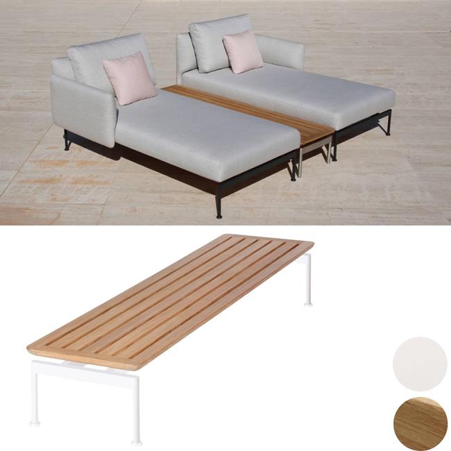 The collection comprises two sizes of upholstered seat (Single & Double Seat widths) and five tables, which together make possible intimate or grand seating corner groups, "L" or "C" Shaped outdoor lounge areas. Upholstered backs and arms are separate components and can fit on any side of the seating units to create sofas, corner sectionals, loungers, chairs, ottomans and many asymmetric configurations. The "Sunbrella" upholstered seats and teak tables use a refined frame made from stainless steel that is then powder coated in a choice of two colours Forge Grey or Arctic White.