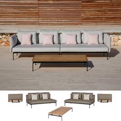 The collection comprises two sizes of upholstered seat (Single & Double Seat widths) and five tables, which together make possible intimate or grand seating corner groups, "L" or "C" Shaped outdoor lounge areas. Upholstered backs and arms are separate components and can fit on any side of the seating units to create sofas, corner sectionals, loungers, chairs, ottomans and many asymmetric configurations. The "Sunbrella" upholstered seats and teak tables use a refined frame made from stainless steel that is then powder coated in a choice of two colours Forge Grey or Arctic White.