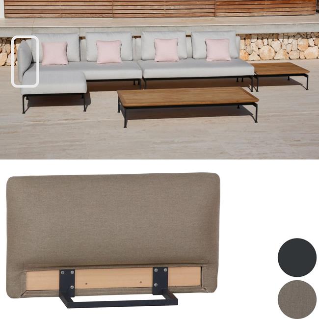 The collection comprises two sizes of upholstered seat (Single & Double Seat widths) and five tables, which together make possible intimate or grand seating corner groups, "L" or "C" Shaped outdoor lounge areas. Upholstered backs and arms are separate components and can fit on any side of the seating units to create sofas, corner sectionals, loungers, chairs, ottomans and many asymmetric configurations. The "Sunbrella" upholstered seats and teak tables use a refined frame made from stainless steel that is then powder coated in a choice of two colours Forge Grey or Arctic White.