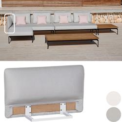The collection comprises two sizes of upholstered seat (Single & Double Seat widths) and five tables, which together make possible intimate or grand seating corner groups, "L" or "C" Shaped outdoor lounge areas. Upholstered backs and arms are separate components and can fit on any side of the seating units to create sofas, corner sectionals, loungers, chairs, ottomans and many asymmetric configurations. The "Sunbrella" upholstered seats and teak tables use a refined frame made from stainless steel that is then powder coated in a choice of two colours Forge Grey or Arctic White.